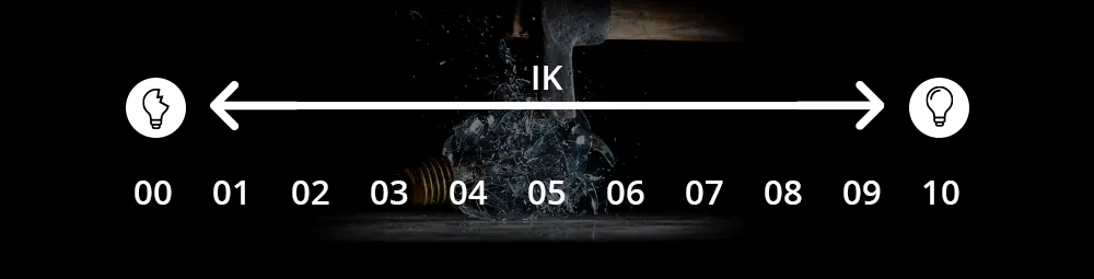 The impact protection value (IK) stands for impact resistance and protection against vandalism. This is expressed in combination with 2 digits (IK00 - IK10). Products with IK00 are not protected against resistance. Products with IK10 offer resistance to shocks of 20 Joule and are also vandal-proof.